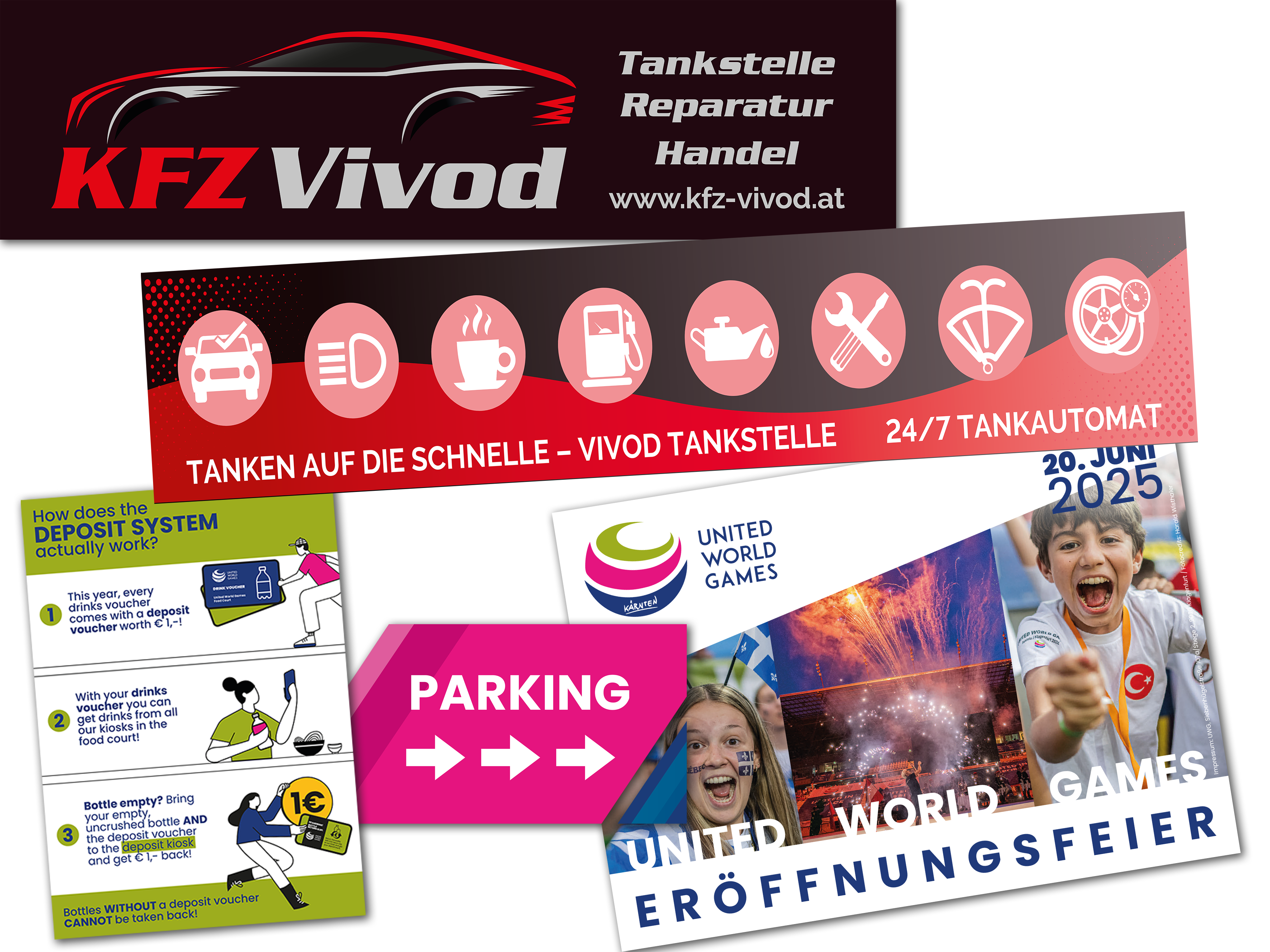 Komplettausstattung von Bannern, Eintrittskarten, Pässen, Gutscheinen, Rollups, Plakaten, Infofoldern, Orientierungskarten bis zu großformatigen Sitzplatzabdeckungen und Messewand ...